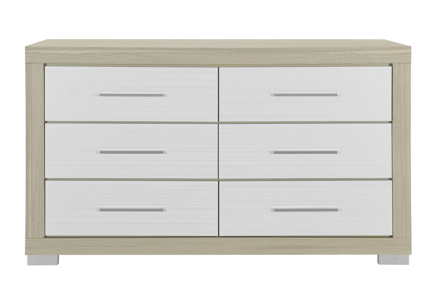 The Emma Dresser adds a touch of sophistication to your bedroom with its sleek two-tone natural wood and white finish. This dresser features multiple spacious drawers, ideal for storing clothing, accessories, and more. With its clean lines and modern design, it offers both style and functionality, perfectly pairing with other pieces of both Emma or Madison collections.