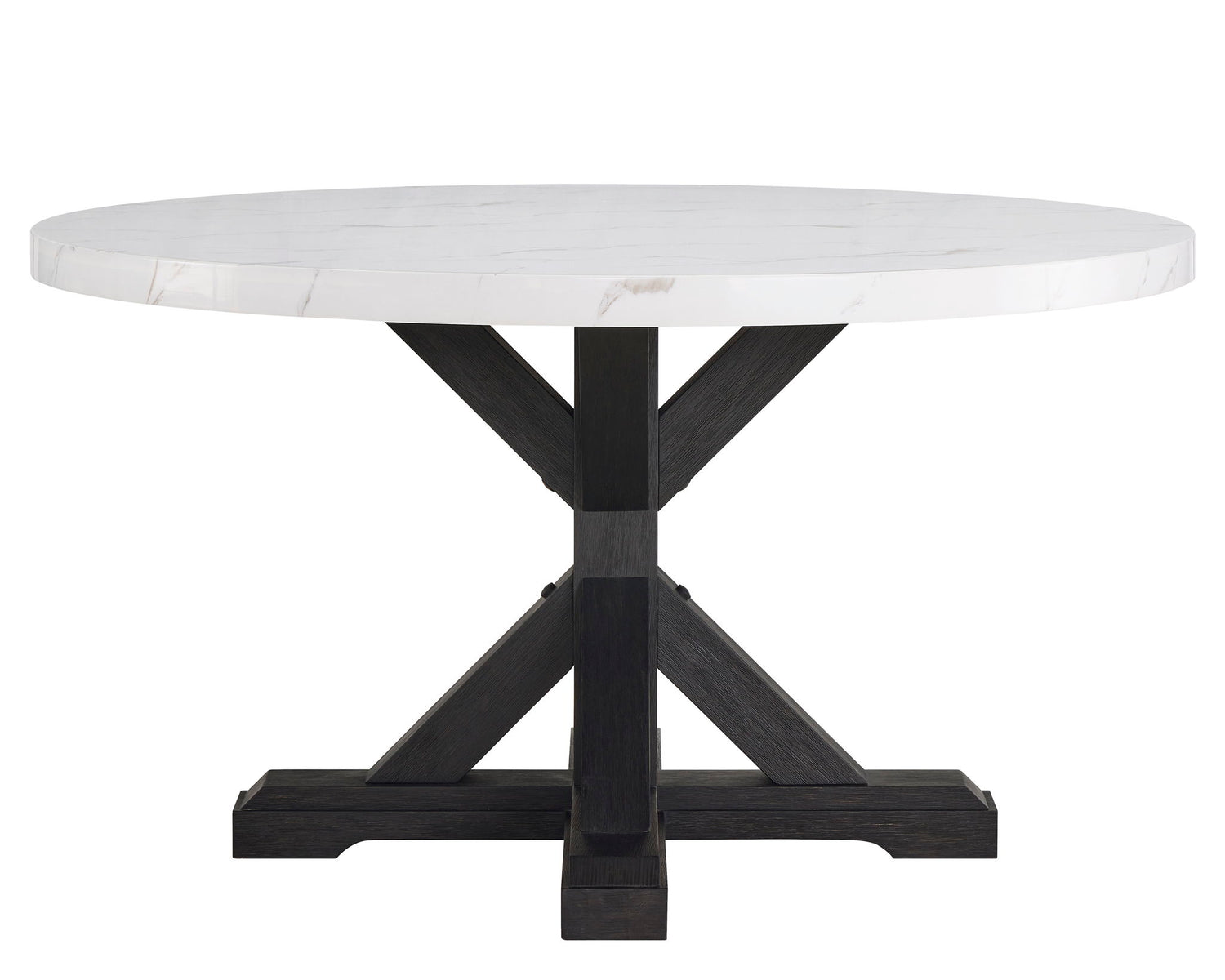 A fresh take on a traditional silhouette makes this group a great addition to your dining space. A faux marble top provides an elegant look while being easy to care for. Farmhouse style cross legs are updated in a contemporary charcoal finish. The upholstered dining chairs feature gently sloped wings and a nail head trim on the back. Button tufting accents the dining bench.