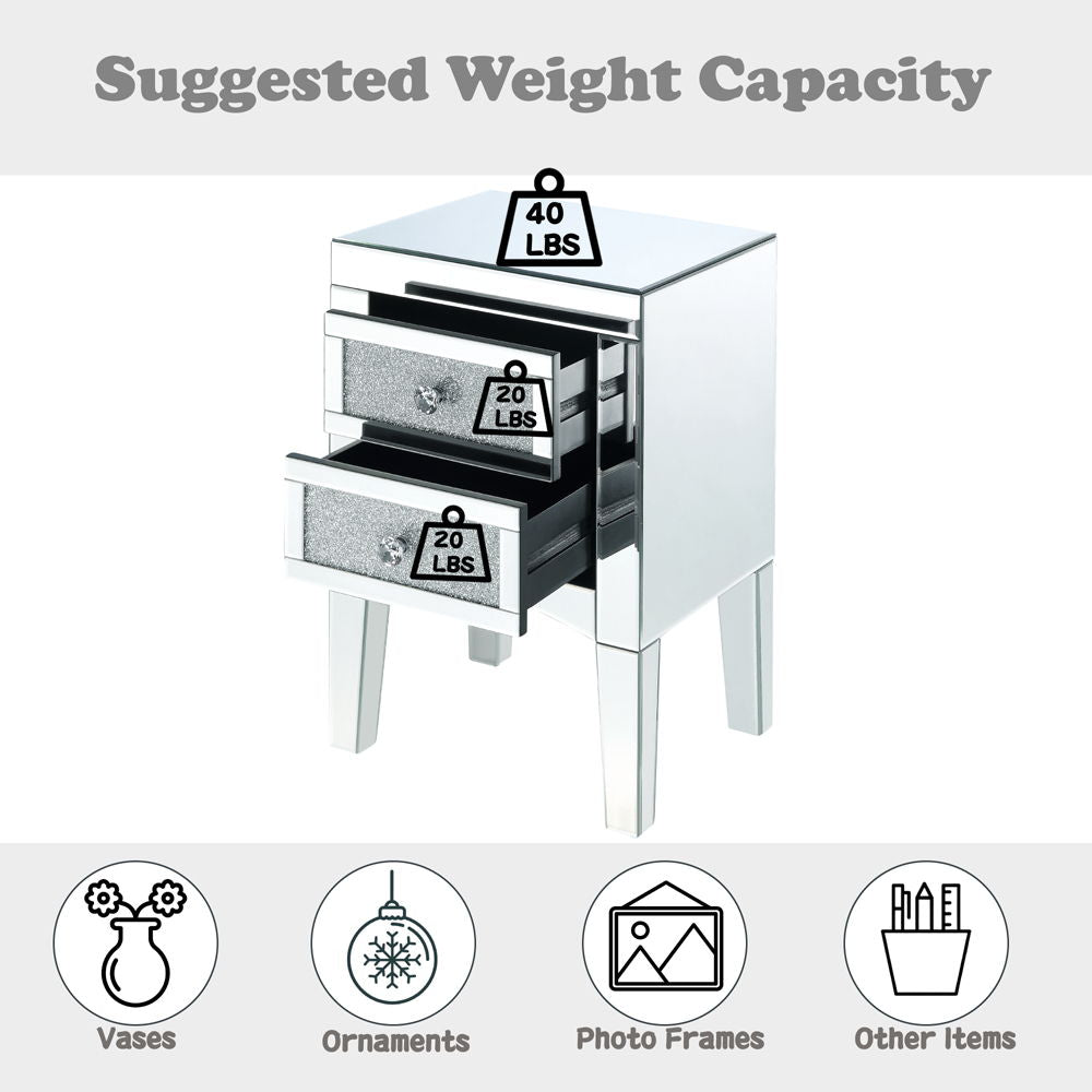 • Features: Mirrored Finish, Front Drawer w/w/Faux Crystals & Clear Glass, Mirrored Tapered Leg (Open Base)