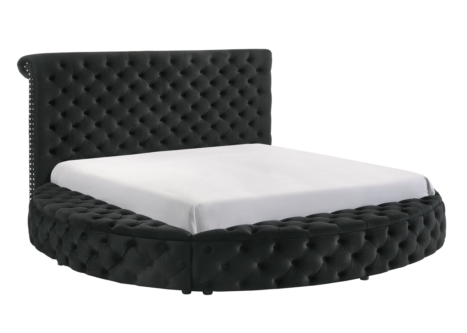 This avant-garde bed is a luxurious retreat, blending opulence with innovative design. Its unique round form challenges traditional bedroom aesthetics, offering a lavish centerpiece that is as comfortable as it is striking. The bed is generously upholstered in a plush black velvet, featuring exquisite button-tufted detailing throughout, which is both visually appealing and sumptuously tactile. Glamorous accents are provided by the studded embellishments along the headboard, adding a touch of sparkle and sophistication. The bed’s innovative design includes a practical storage system, discreetly hidden to maintain its sleek profile.