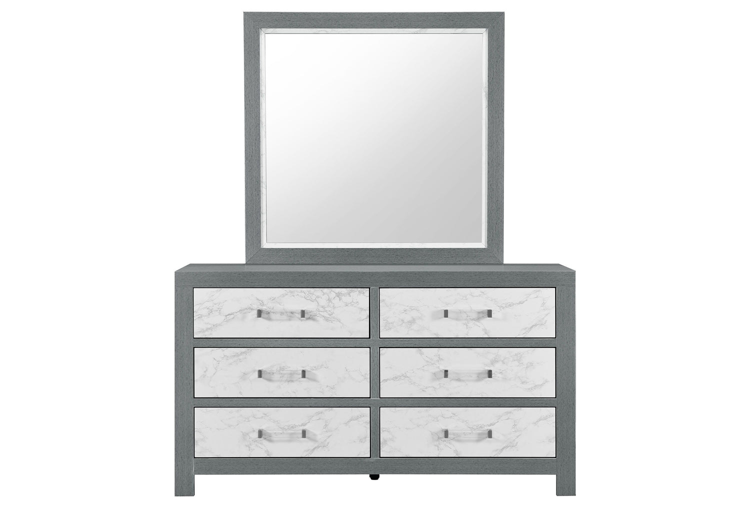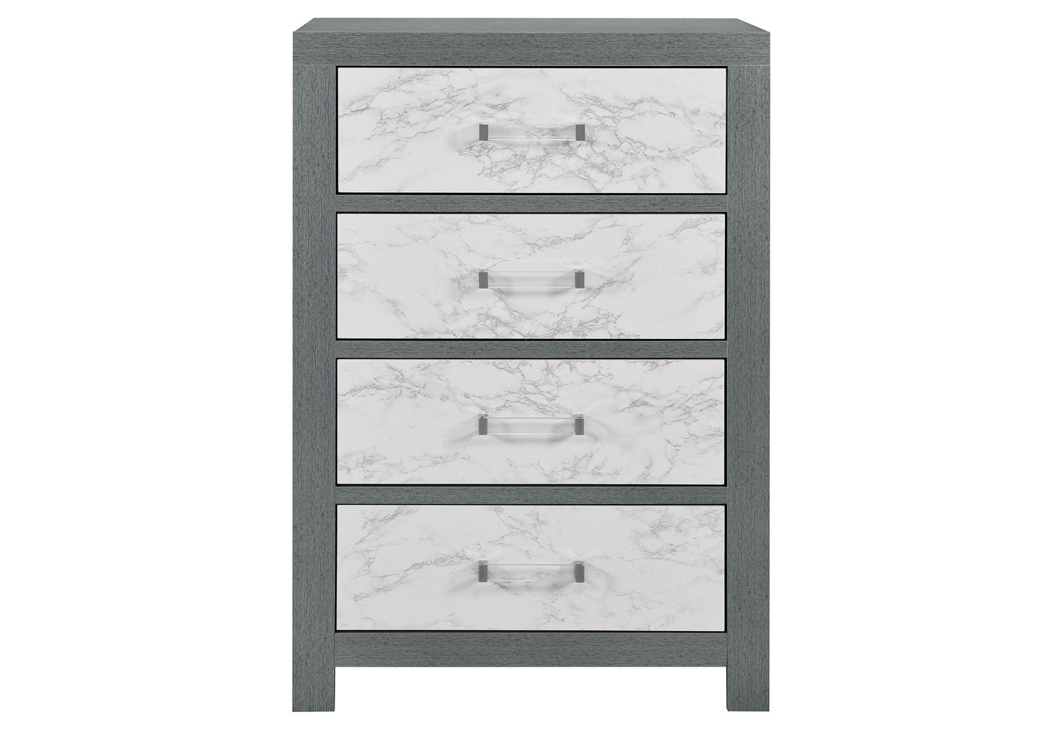 Elevate the elegance of your personal haven with the Micah Bedroom Collection by Global Furniture USA. This exquisite ensemble showcases a striking blend of contemporary design and classic luxury. Each piece in the Micah Collection is finished with a harmonious contrast of lustrous silver and sophisticated faux marble, creating an opulent aesthetic that commands attention. The bed, the centerpiece of the collection, boasts a captivating chevron design on both the headboard and footboard, adding a touch of geometric flair to the bedroom's ambiance. The accompanying case goods, including a dresser, nightstand, and chest, mirror this unique style with faux marble drawer fronts, while sleek acrylic and chrome drawer pulls add a modern twist. Designed for those who appreciate the finer details, the Micah Bedroom Collection offers a chic retreat where comfort meets high-end style.