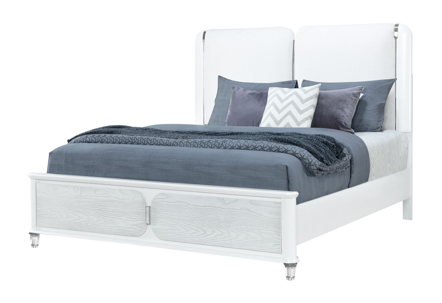 The Apollo Bed stands out with its upholstered headboard, enhanced by LED accent lighting. Its light grey finish adds a touch of modern elegance, making it the perfect centerpiece for your bedroom.