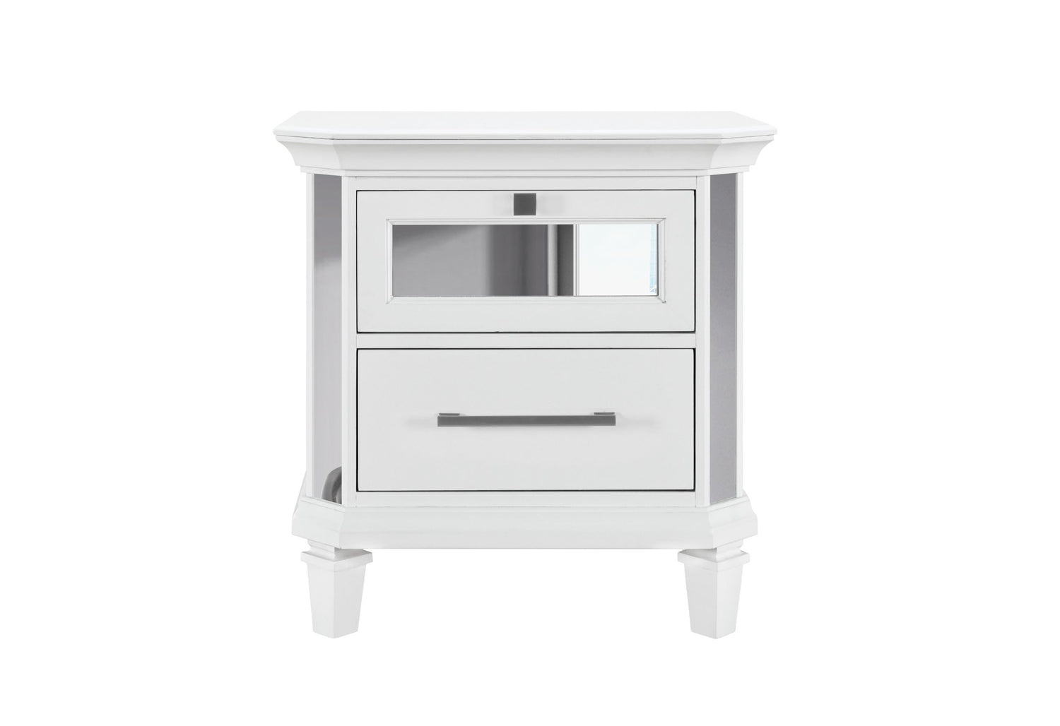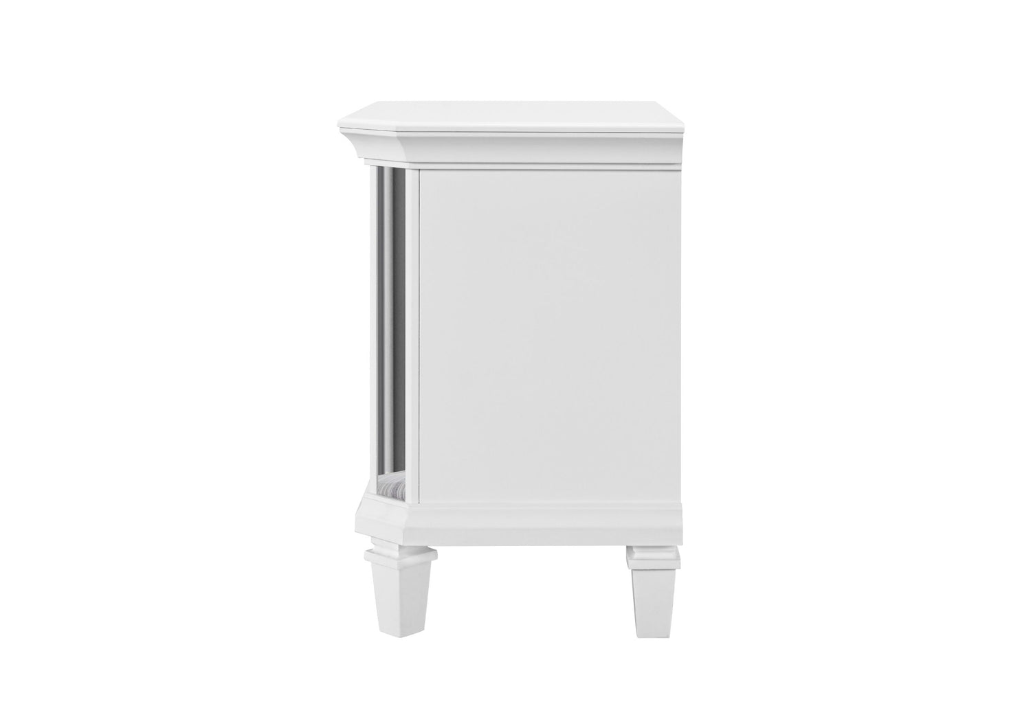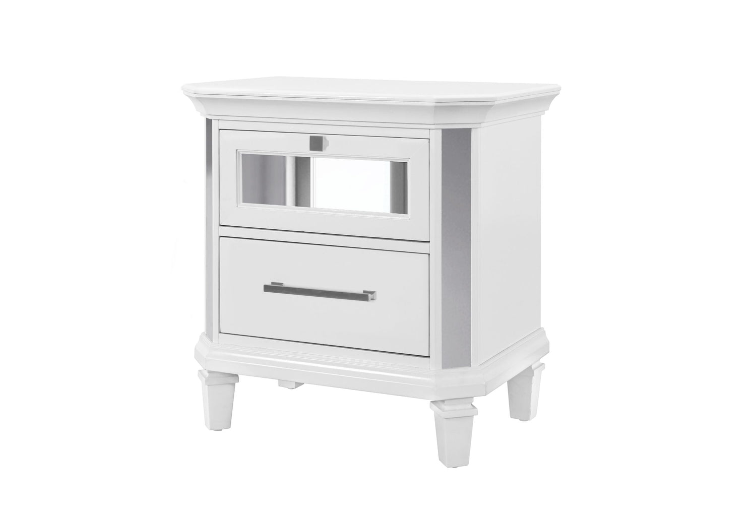 The Marco Nightstand is the perfect bedside companion, with a lustrous metallic white finish and reflective mirrored accents. Its compact size belies its spacious drawers, offering convenient storage within arm's reach.