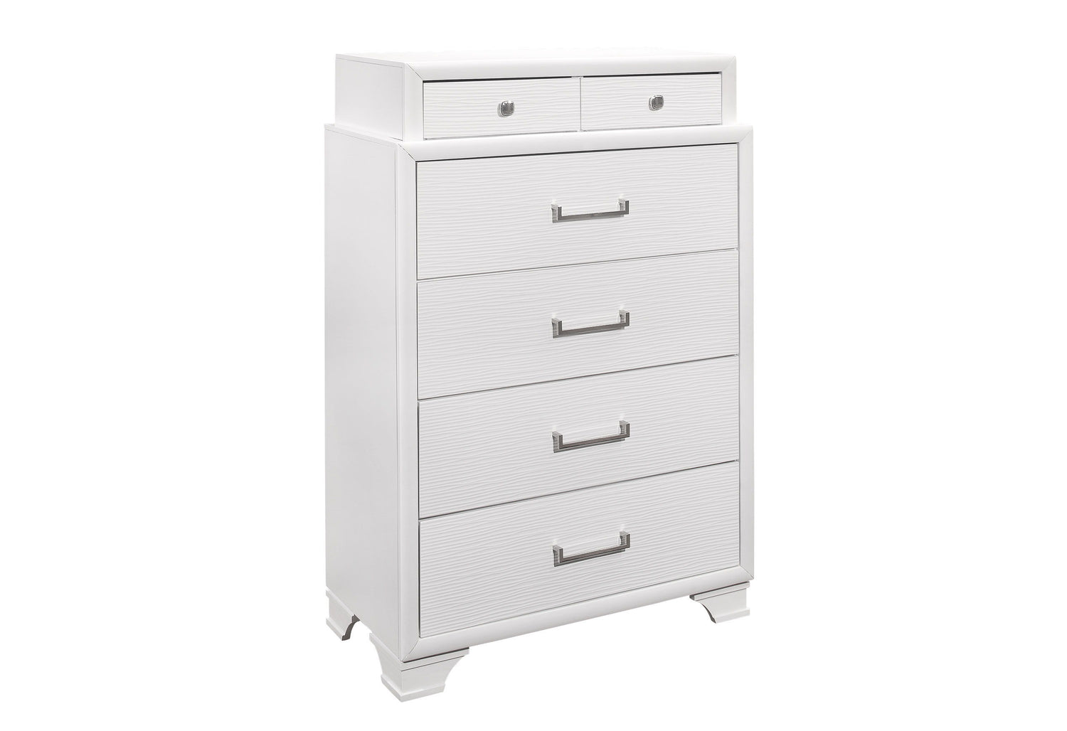 Introducing the Jordyn Bed Group from Global Furniture USA, the ultimate statement for any bedroom. The bed is designed with a platform design, eliminating the need for a box spring while adding room for storage drawers. The headboard features built-in lighting and two storage drawers for convenience. All case pieces are lacquer finished and feature nickel hardware. Upgrade your bedroom with the Jordyn Bed Group and enjoy its sleek and modern design for years to come.