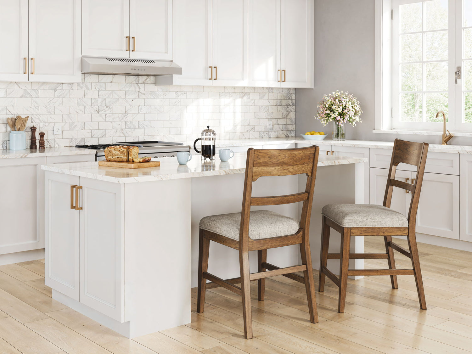 This counter height bar stool sits comfortably at the intersection of modern lodge and farmhouse aesthetics. Your warm and welcoming disposition is reflected in the charming architectural elements and neutral textural fabric. Even with its poise, the stool remains practical. Its cushioned seat invites you to linger longer at the table, defining your dining room with reliable function and style.