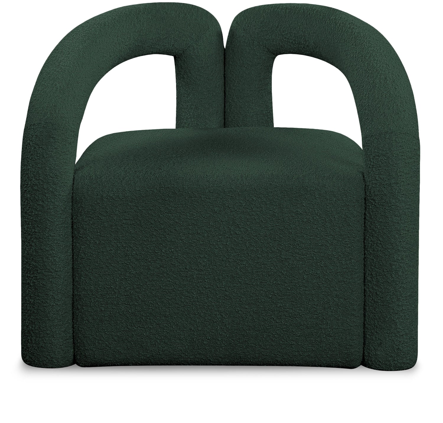Liven up your home with this unique Otto accent chair. Crafted from a mixture of plywood, metal, foam, and fabric, this open-back chair is durable and sturdy enough to support just about anyone who sits on it. Its curved back provides a cushy surface to rest your back, and its open back style makes a bold statement in any modern living space. Its thick foam seat offers you a cozy place to rest your weary bones, and rich green boucle fabric adds to its style and comfort.