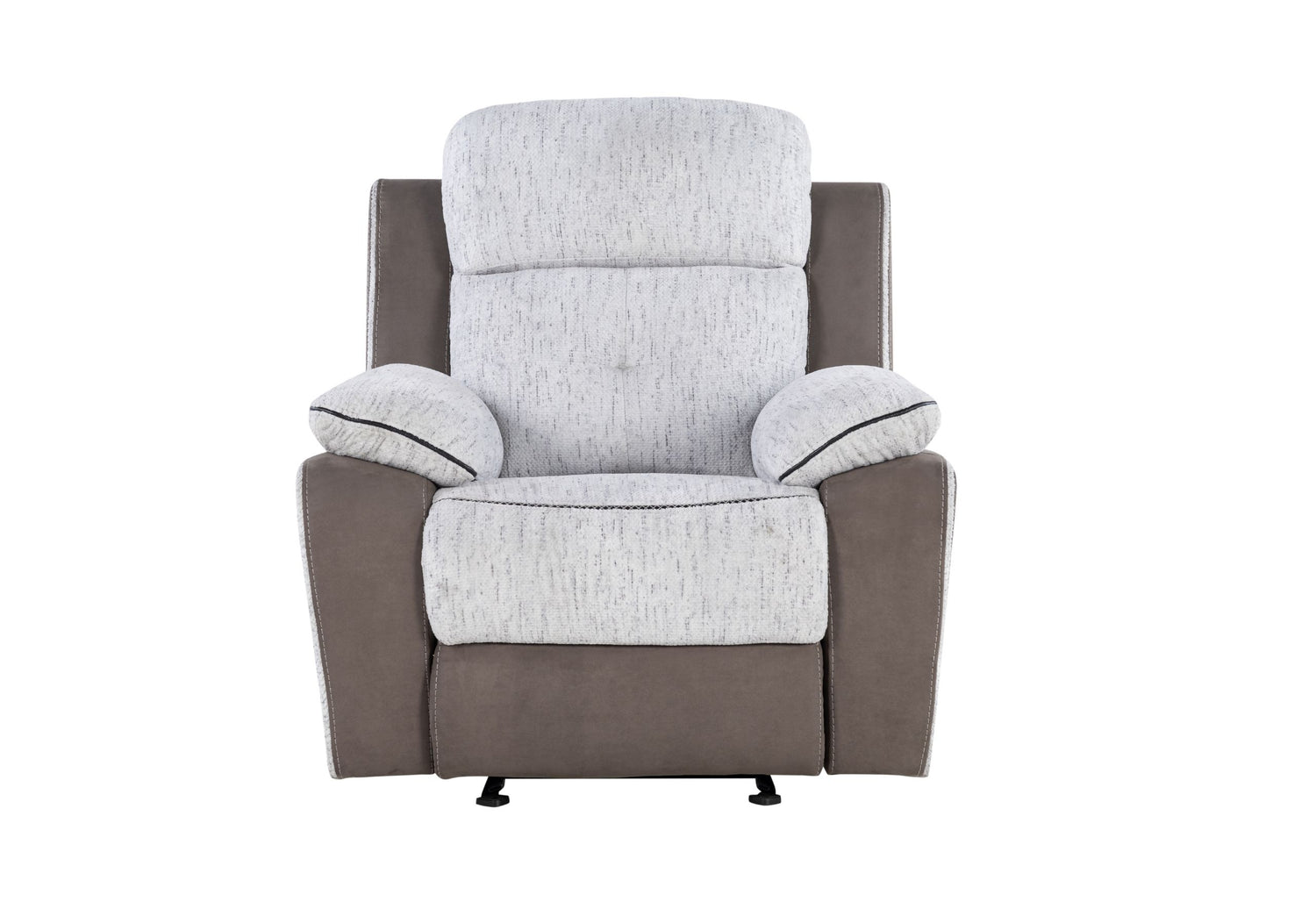 Sink into luxury with the U5050 Recliner by Global Furniture USA. This recliner features manual reclining functionality, metal reclining handles, and eye-catching baseball stitching accents. The sophisticated two-tone light and dark grey fabric finish makes it a standout addition to any room.