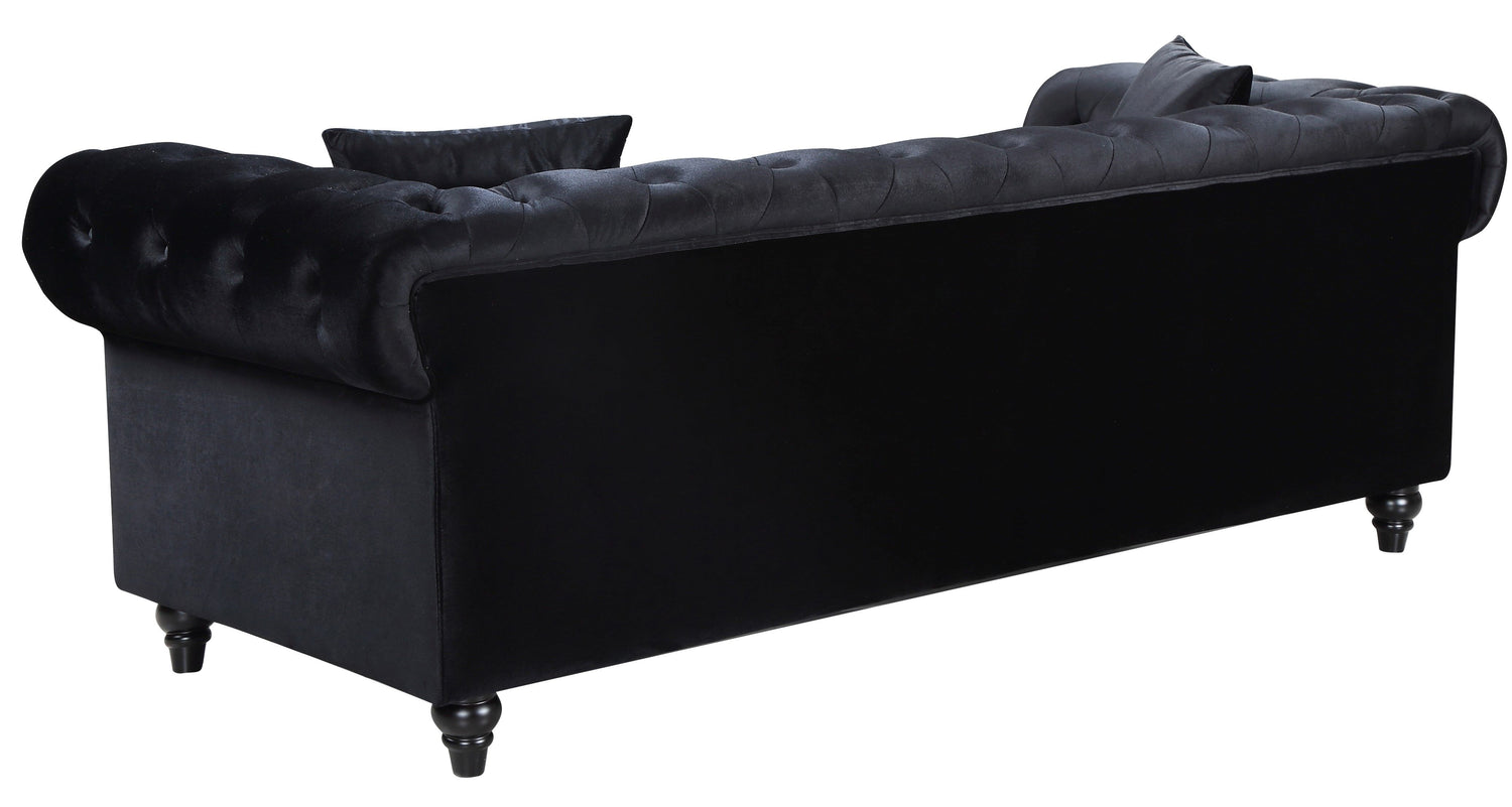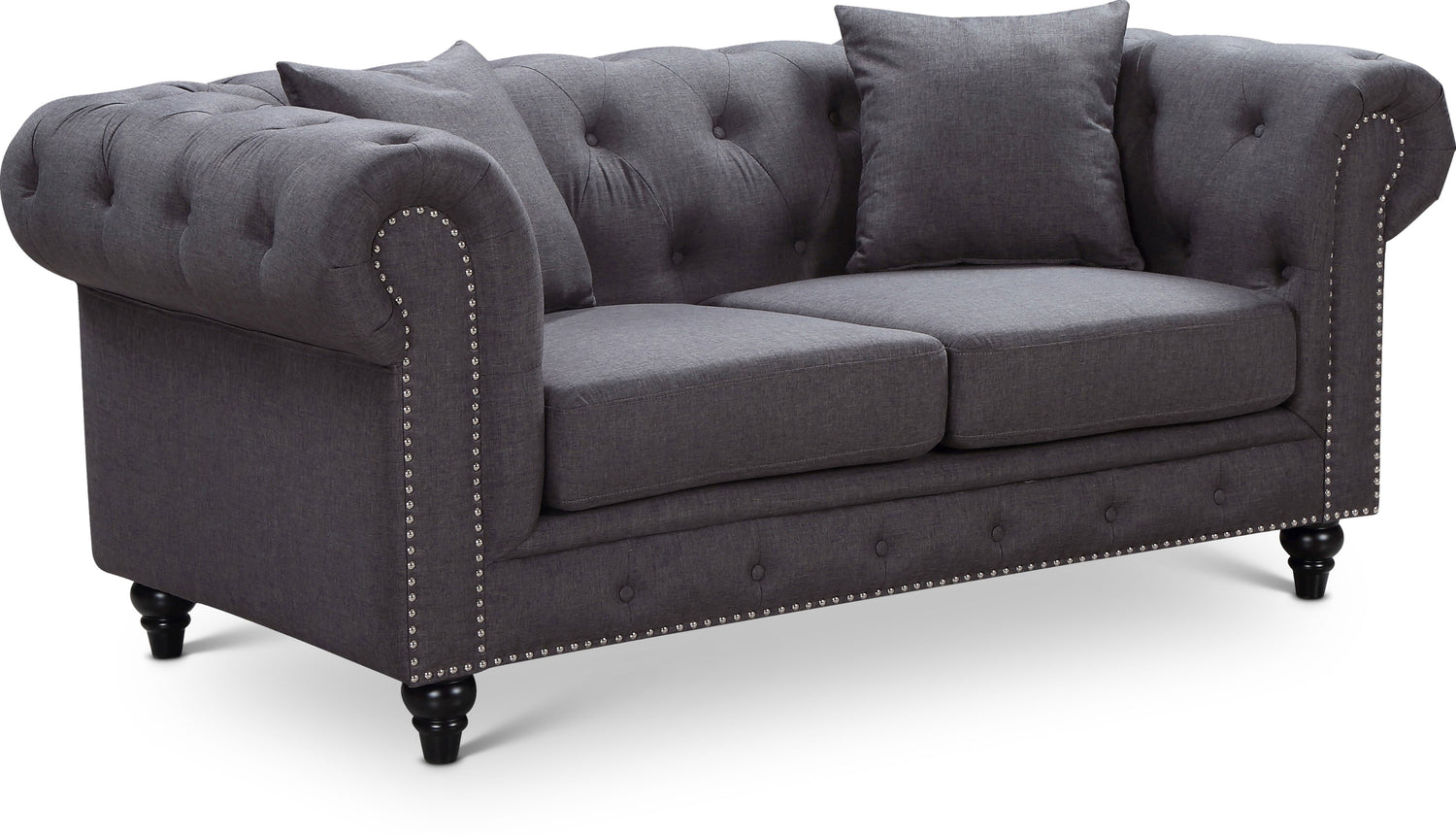 Elegant and eye-catching, the stunning Chesterfield Living Room from Meridian Furniture is the perfect addition to any space. covers the plush, comfortable seat, padded with high-density foam and modern tufted design. Strength and beauty is guaranteed with a solid wood frame and legs. Features a nail head design on the arms and includes matching throw pillows.