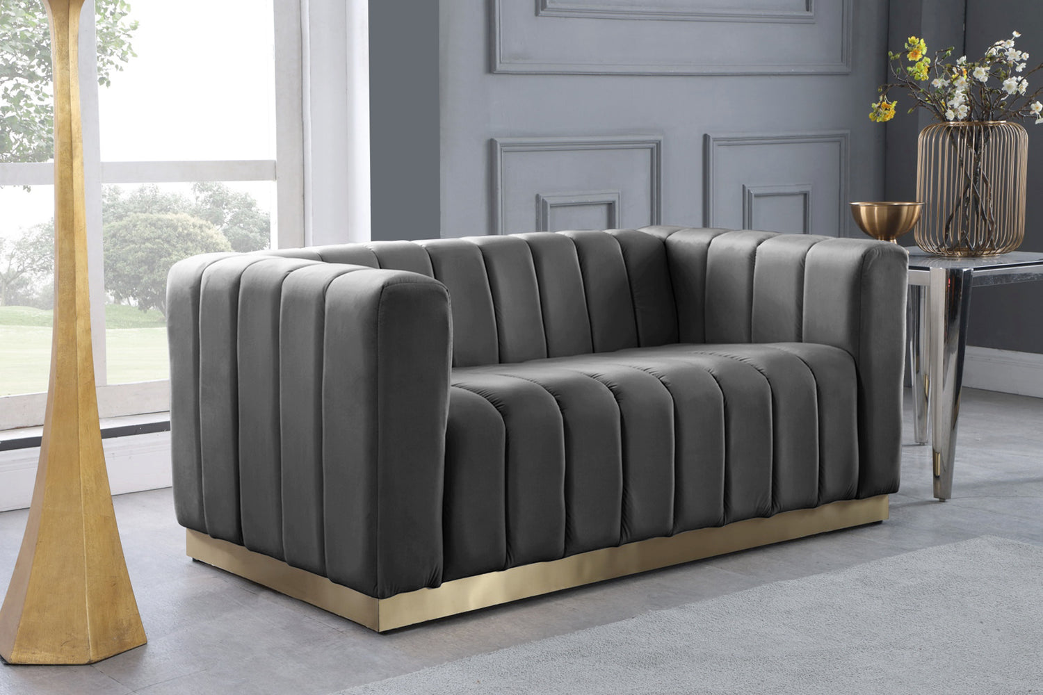 Seat guests in the epitome of comfort and style with this Marlon velvet loveseat. This piece is just the thing to showcase your modish style while ensuring total enjoyment from all who are lucky enough to relax on its channel tufted seats. The soft velvet upholstery adds a beautiful touch to your space and feels great against your skin while the brushed gold stainless steel base lends it a contemporary finish.