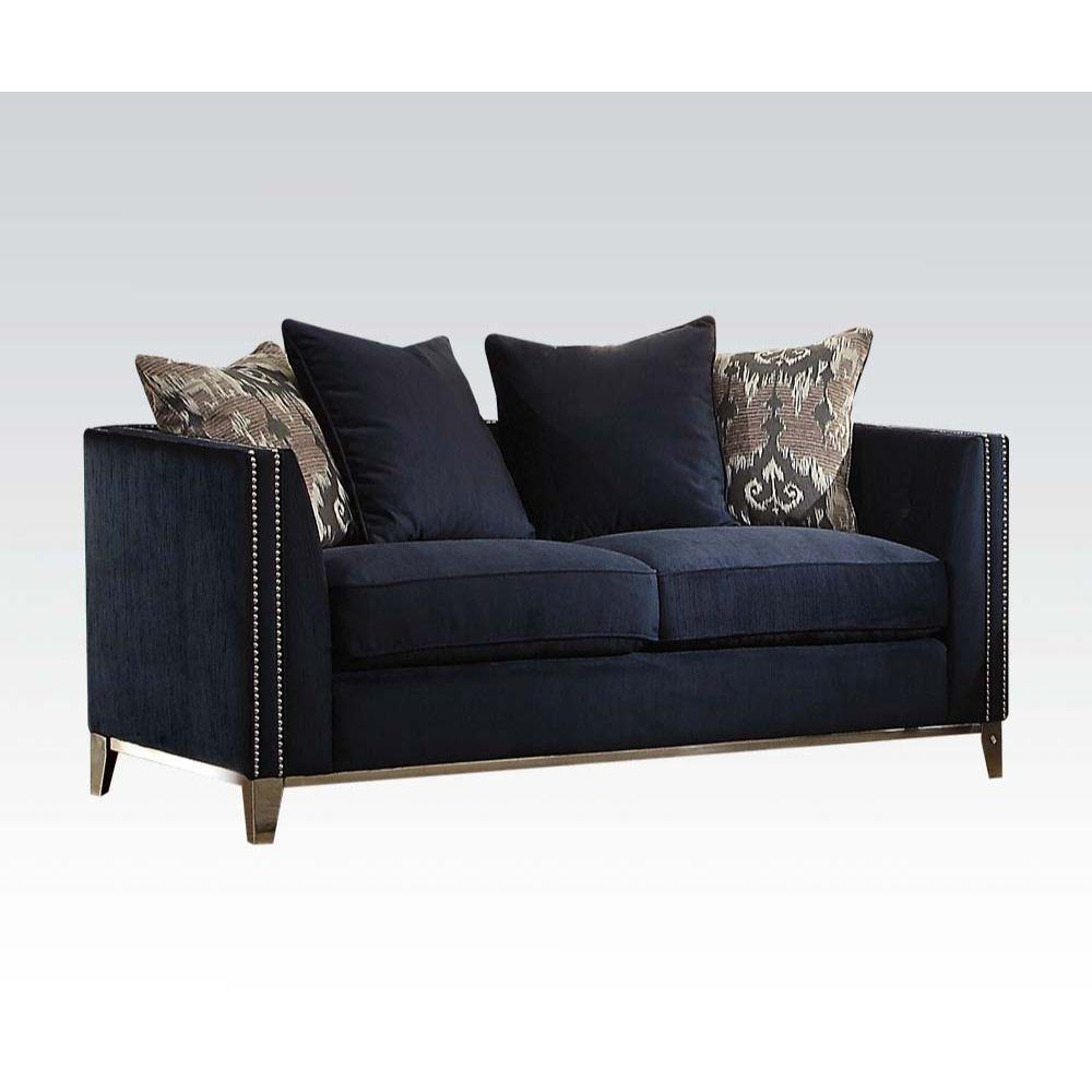 The Phaedra loveseat is an ideal choice for any living room. This blue upholstered loveseat features decorative Nailhead trim, duck feather filing, tight back and loose seat cushions. Four pillows are included for better and comfortable back support. Strength and beauty is guaranteed with a metal frame base and sliver stainless steel legs. This loveseat will become the most relaxing area in your fast pace life. Fully Assembled.