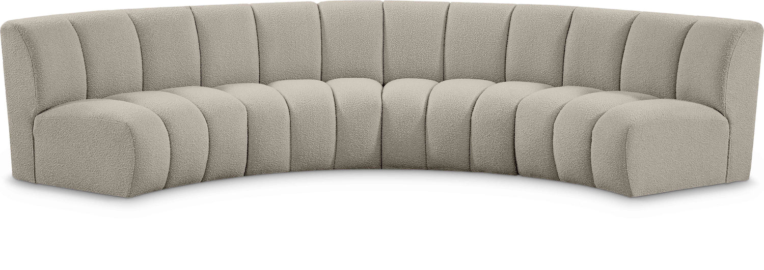Mix and match this Infinity boucle fabric modular chair with other items in the Infinity collection to find the best possible seating solution for your gang. Rich taupe boucle fabric feels welcoming and soft to the skin, so you stay seated comfortably for the big game or while watching your favorite programs. Deep channel tufting adds to the longevity and durability of this modular chair while giving it texture.