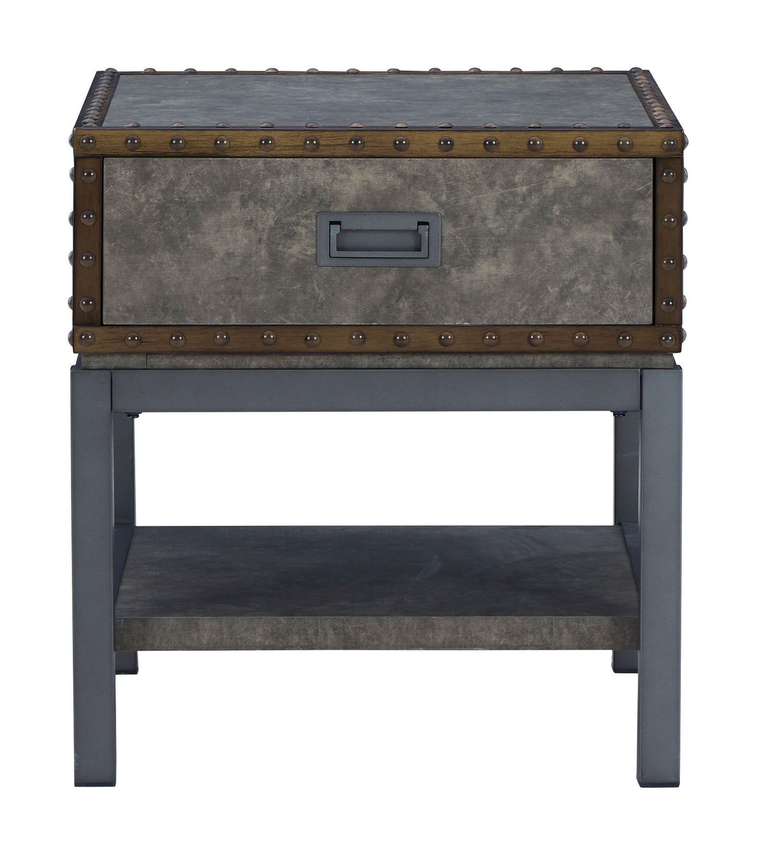 Reinvented for the here and now, this end table rocks vintage industrial design with a traditional vibe. Its metal accent trim and bronze-tone metal base are ready to embrace the modern demands of everyday life. A lower shelf and a fully finished drawer provide plenty of storage, while the built-in power supply with dual USB charging keeps your devices charged up and ready.
