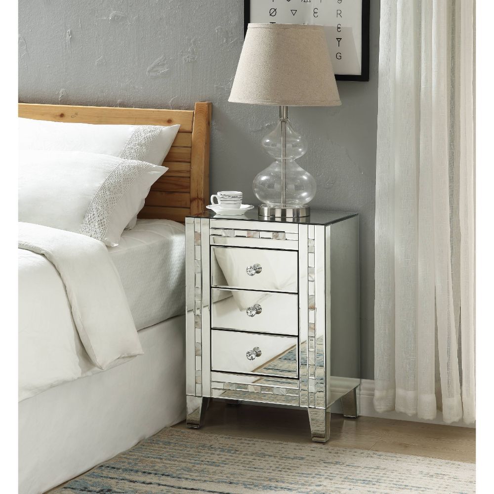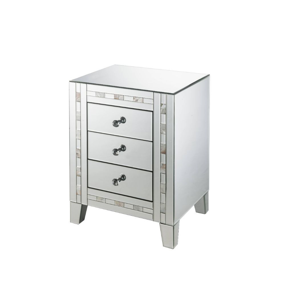 Style and storage abound in the pretty and practical design of the Nasa Side Table. Three drawers offer plentiful enclosed storage for remotes, magazines, or any other items you prefer to keep close at hand. Its three drawers boast crystal knobs and framed by mirrored glass panels with mother pearl stones inlay trim.
