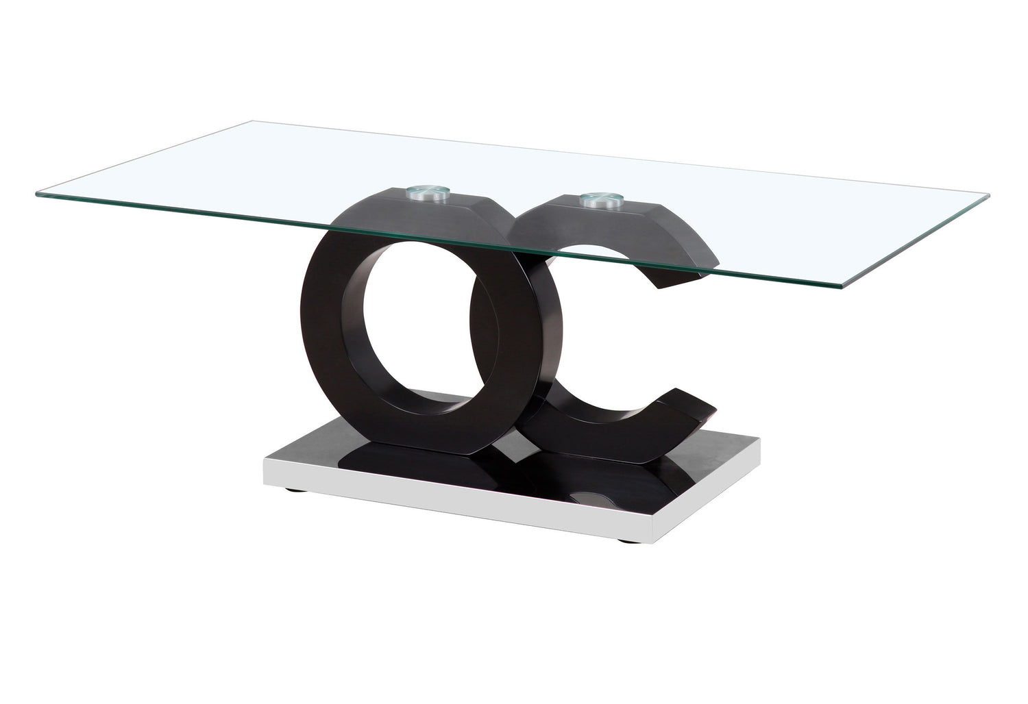 Add a touch of drama and visual excitement to your seating area with this ultra-modern plank style Coffee table. This uniquely designed coffee table is constructed of sturdy MDF over Stainless Steel and metal base components and features a beautiful glass tabletop. Gleaming black toned base and tabletop supports add a touch of sophistication and appeal. The abstract styling of the table base creates a unique look, sure to make updating your seating area easy and fun.
