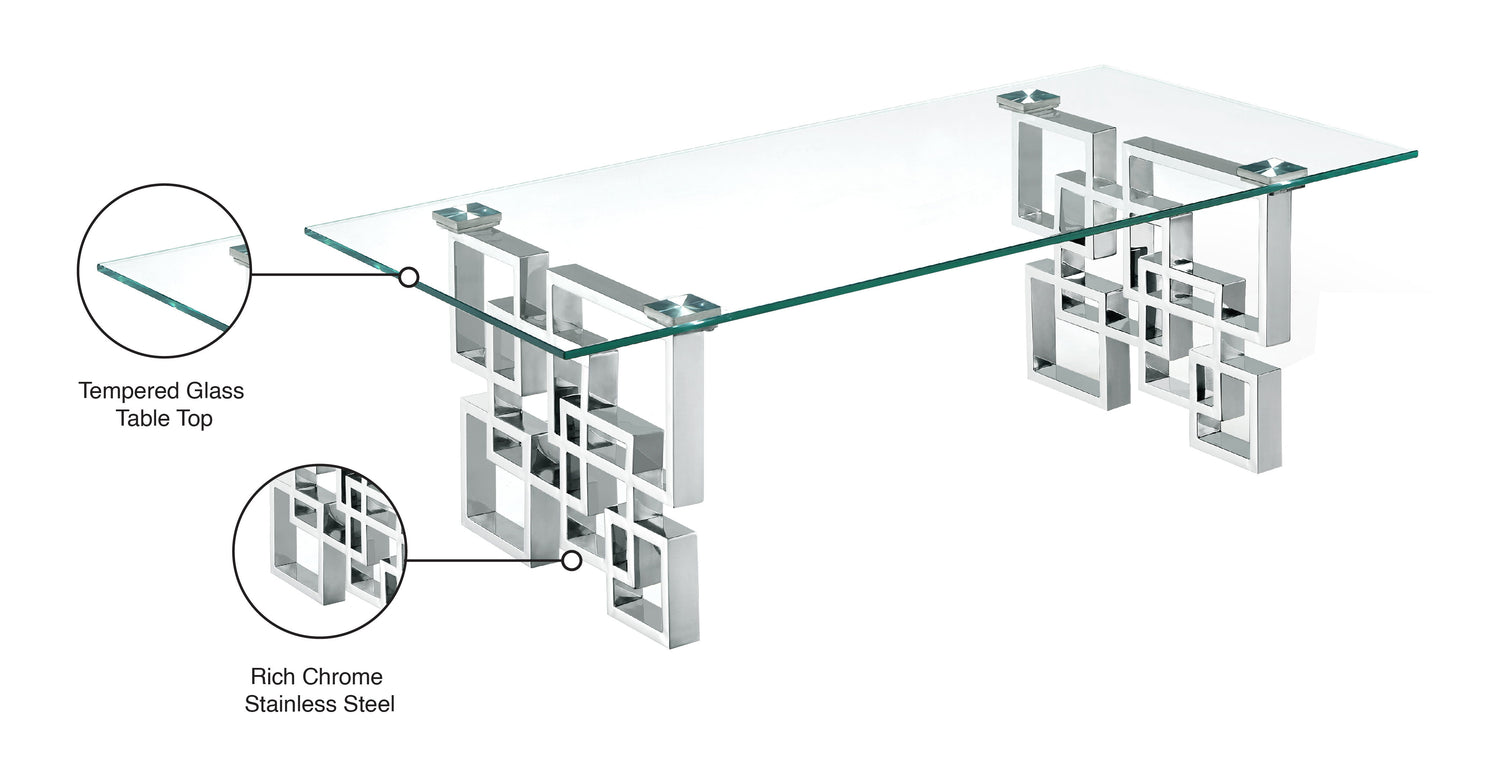 Enjoy a contemporary look in your living room or den with this stylishly elegant Alexis chrome coffee table. This Meridian Furniture table is made from glass and metal for a sleek, modish look. The base features a geometric design with intertwined squares that form two pedestals. The top is crafted from thick, clear glass that allows the beauty of the base to shine through completely. A chromed finish shores up the design, adding to its up-to-the-minute feel.