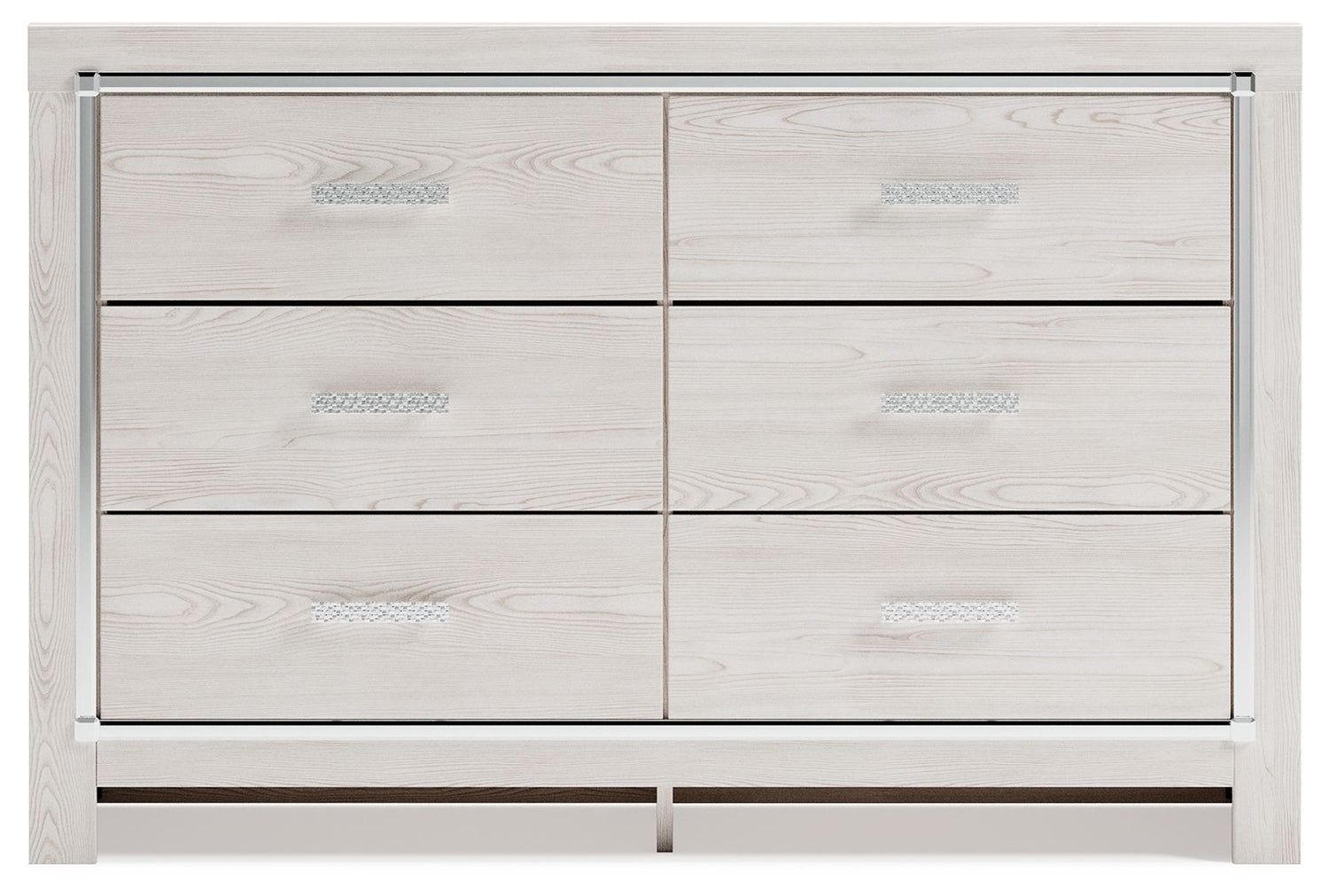 Light finish with subtle pearl effect over replicated cedar grain and authentic touch. Cases and bed are accented with faceted chrome details. Large scaled chrome handle with mosaic details. Side roller glides for smooth operating drawers. Drawer interiors lined with a replicated linen design for a clean finished look. Queen/full (57) and king/cal king (58) upholstered panel headboards are accented with LED lighting and include a remote for color and brightness options. Included remote holder discreetly keeps light remote accessible. Queen (57,65) and king (58,69) headboards are accented with emulated crystal tufted gray upholstery. Queen (65) and king (69) upholstered panel bookcase headboards feature glitter details accented with LED lighting. Both king and queen beds have a panel footboard (54,56) and storage footboard option (54S, 56S). Queen (57,65) and king (58,69) headboards can attach to a bolt-on metal bed B100-31 or B100-66 respectively. Both USB and Qi wireless charging options are provided with the nightstand. Queen (54, 54S, 65) and king (56, 56S, 69) can use -95 platform rails and require B100-13 (queen) or B100-14 (king) roll slats eliminating the need for a box spring. Safety is a top priority, clothing storage units are designed to meet the most current standard for stability, ASTM F 2057 (ASTM International). Drawers extend out to accommodate maximum access to drawer interior while maintaining safety.